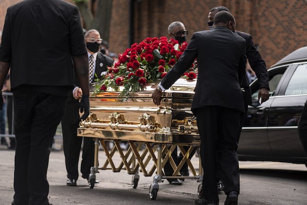 Mr. Floyd's casket is wheeled to a hearse after a June 4 memorial at North Central University. Reverend Al Sharpton delivered a eulogy for Mr. Floyd in front of gathering of his family, politicians and celebrities.Stephen Maturen/Getty Images/Getty Images