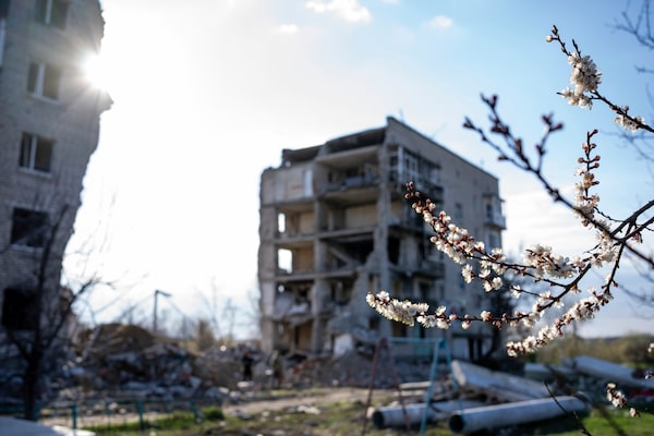 An apricot tree blooms in front of a destroyed apartment building in Izium, Kharkiv region, Ukraine, on April 6.Alex Babenko/The Associated Press
