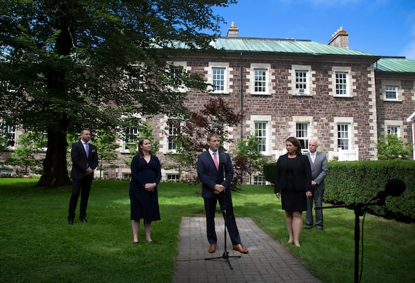 Andrew Parsons, left, Sarah Stoodley, centre-left, Premier Andrew Furey, centre, Siobahn Coady, centre-right and Tom Osborne speak after the Premier's swearing-in ceremony on the grounds of Government House in St. John's on Aug. 19, 2020.Paul Daly/The Canadian Press
