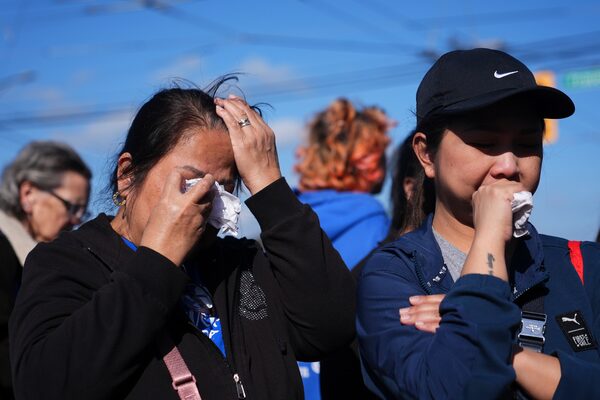 Two people react at a memorial after a vehicle drove into a crowd during a Filipino heritage festival in Vancouver on April 25.Lindsey Wasson/The Associated Press