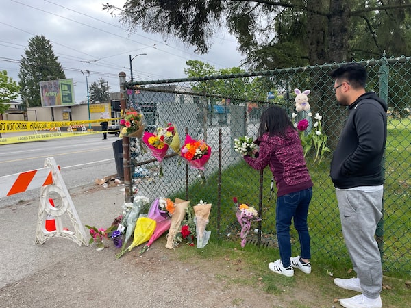 Nida Salinas and her nephew Patrick Cruz, members of the Filipino community, place flowers at Fraser and 41st on the morning of April 27.Marsha Lederman/The Globe and Mail