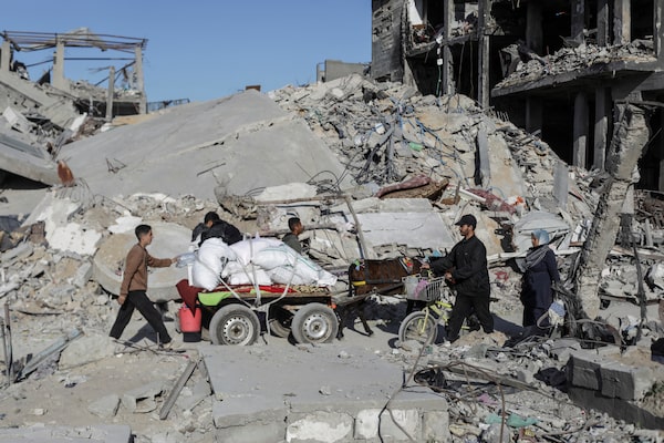 Palestinians walk past destroyed homes, amid a ceasefire between Israel and Hamas, in Jabalia Refugee Camp, northern Gaza Strip, Jan. 20, 2025.Mahmoud Issa/Reuters
