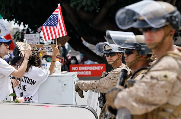 Protesters demonstrate in front of U.S. Marines guarding a federal building on Saturday in Los Angeles.Mario Tama/Getty Images