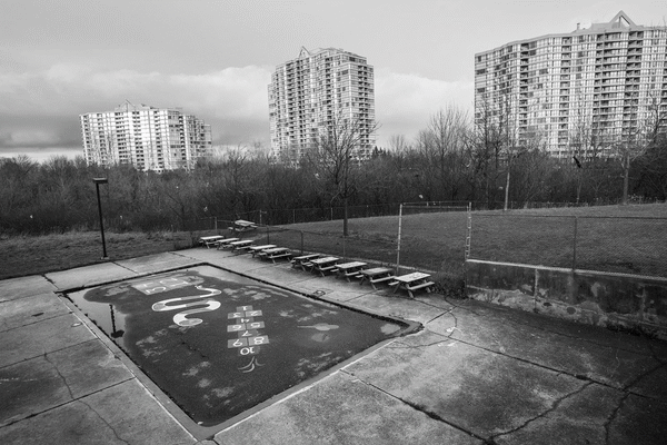 In Rexdale, buildings loom behind an old swimming pool converted into a playground.photo illustration (picture: Jennifer Roberts/The Globe and Mail)