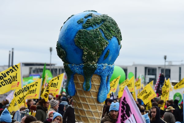 A melting planet in an ice cream cone is held up during the Global Climate March in Berlin in 2015.JOHN MACDOUGALL/AFP