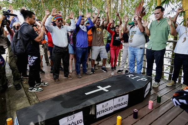 Indigenous activists stage a protest and mock funeral for fossil fuels in Coca, Ecuador, last month.Karen Toro/Reuters
