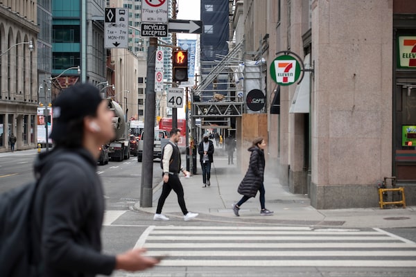 Pedestrians cross Bay Street in Toronto’s Financial District, on April 12.Fred Lum/The Globe and Mail