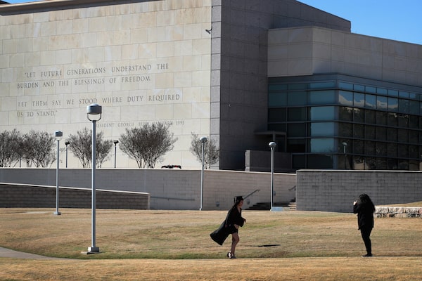 Visitors walk behind the George H.W. Bush Presidential Library Center on the campus of Texas A&M University in December, 2018. Professor Martin Peterson was told he is no longer allowed to teach Plato’s Symposium in his ethics class.Scott Olson/Getty Images