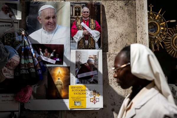 A nun walks past pictures of the late Pope Francis and the newly elected Pope Leo XIV at a souvenir shop in Rome on May 9.Eloisa Lopez/Reuters