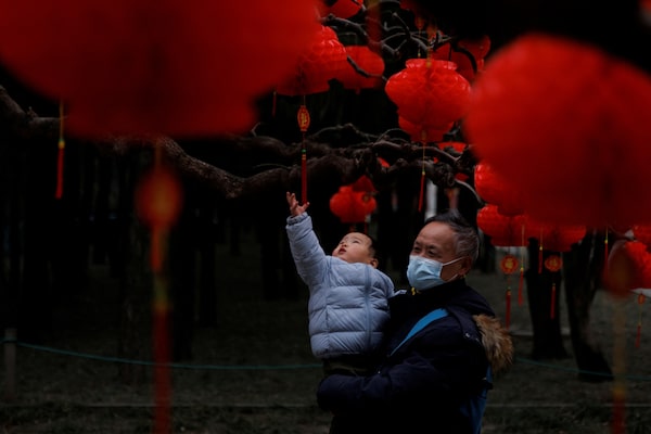 An elderly person helps a child reach for festival ornaments in a Beijing park this past January. Eight years ago, China abandoned its decades-old one child policy as it faced the prospect of a rapidly aging population with fewer working-age people to meet its needs.Thomas Peter/Reuters