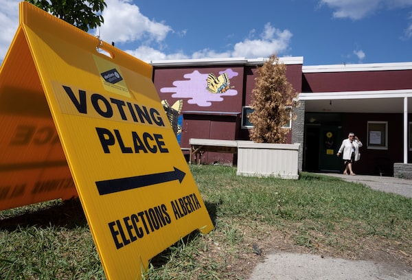 A woman walks out of a voting station during Election Day in Calgary, Alberta, on May 29, 2023.TODD KOROL/Reuters