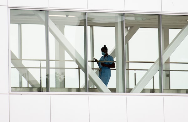 A healthcare worker crosses a covered overhead walkway at a hospital in Montreal on Aug. 17, 2021.Graham Hughes/The Canadian Press