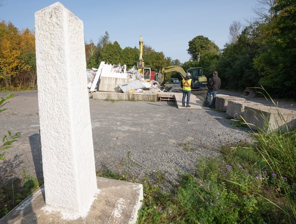 A marker identifying the border between Canada and the U.S. stands near workers demolishing the temporary installation for refugee claimants at Roxham Road on Sept. 25, in St. Bernard-de-Lacolle, Que.Ryan Remiorz/The Canadian Press