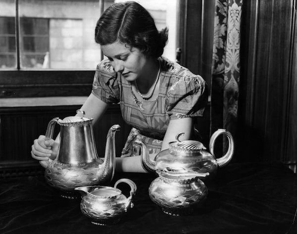 A woman polishes a silver tea service at the Silverwork Exhibition at the Goldsmith's Hall in London on June 29, 1951.Hulton Archive/Getty Images