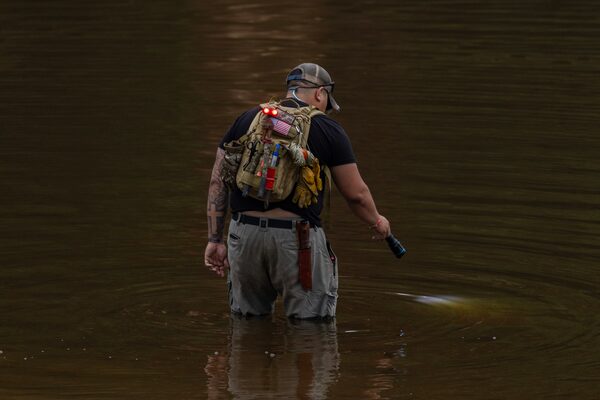 I keep staring at a photograph of a searcher in Texas. He’s standing thigh deep in the swollen Guadalupe River near Camp Mystic, the girls’ summer camp that was flooded in the early morning hours of July 4. He’s pointing a flashlight into the water, struggling to see into the murk.