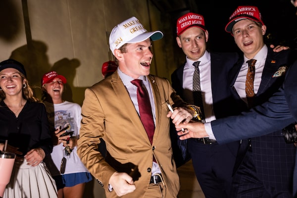 Supporters of president-elect Donald Trump cheer together as they arrive at his election watch party in West Palm Beach, Fla., Nov. 5, 2024.Scott McIntyre for The New York/The New York Times News Service