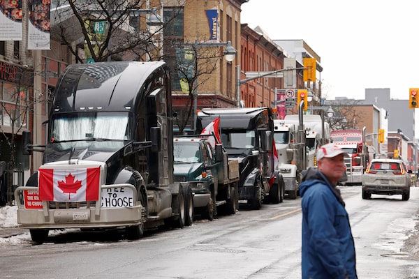 Vehicles queue on Bank Street as truckers and supporters continue to protest COVID-19 vaccine mandates, in downtown Ottawa on Feb. 9, 2022.BLAIR GABLE/Reuters