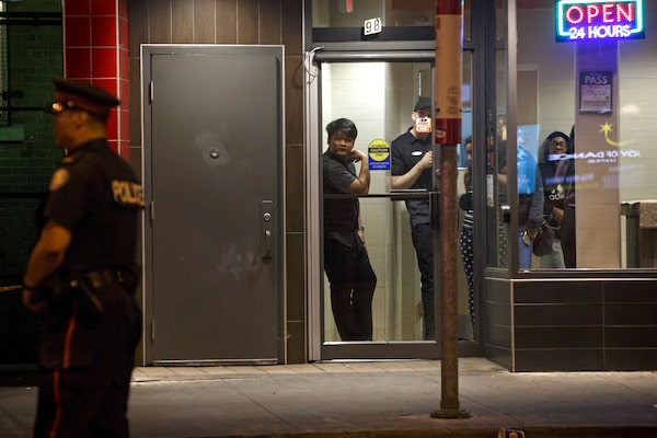People look out the window from a restaurant as Toronto Police officers stand watch at Danforth Avenue at the scene of a shooting in Toronto on July 23, 2018. A gunman opened fire in the city's Greektown neighbourhood on Sunday night, injuring 13 people including a child and killing two.COLE BURSTON/AFP/GETTY IMAGES