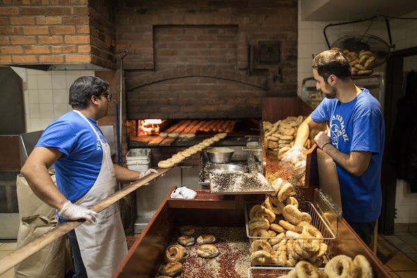 Suresh de Silva, left, and Ali Nemati make bagels in the wood-burning oven at Montreal's St-Viateur Bagels.Dario Ayala/The Globe and Mail
