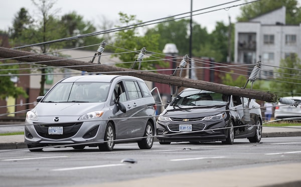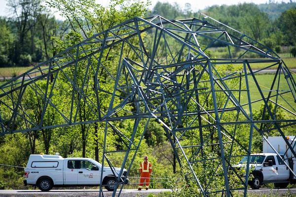 A utility worker near a transmission tower that was damaged in a major storm in Ottawa, on May 24.Justin Tang/The Canadian Press