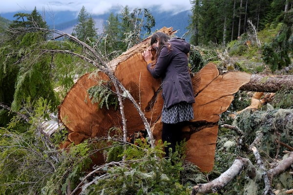 A woman, who was among activists trying to stop the logging of old growth timber, embraces the stump of a large tree in a cut block of Tree Farm licence 46 near Port Renfrew, British Columbia, Canada on May 17, 2021.JENNIFER OSBORNE/Reuters