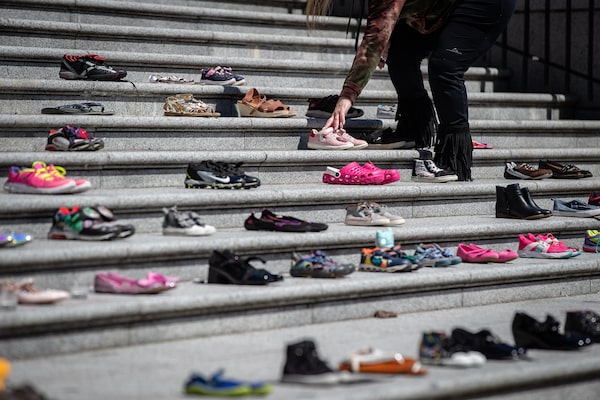 A woman places one of 215 pairs of children's shoes on the steps of the Vancouver Art Gallery as a memorial to the 215 children whose remains have been found buried at the site of a former residential school in Kamloops, in Vancouver, on May 28, 2021.DARRYL DYCK/The Canadian Press