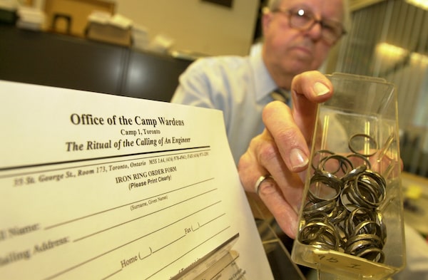 Malcolm McGrath, B.A.Sc., P.Eng., secretary of Camp 1 of the Faculty of Applied Science and Engineering at U of T, shows the iron rings that are given out to engineering graduates across Canada, in Jan. 7, 2003.Patti Gower/The Globe and Mail