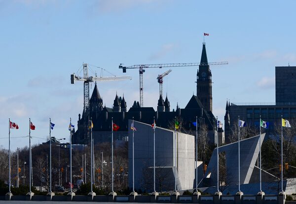 Construction cranes on Parliament Hill as the Canadian provincial and territorial flags blow in Ottawa on March 29, 2021.Sean Kilpatrick/The Canadian Press