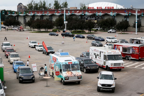 Drivers wait for food during a Stampede Food Truck Rally as people try to enjoy the Calgary Stampede even though it has been cancelled, in Calgary, on July 4, 2020.Jeff McIntosh/The Canadian Press