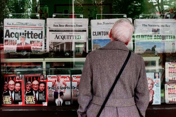 A news stand in Sacramento, Calif., announces Bill Clinton's acquittal by the Senate on Feb. 13, 1999.Bob Galbraith/The Associated Press/The Associated Press