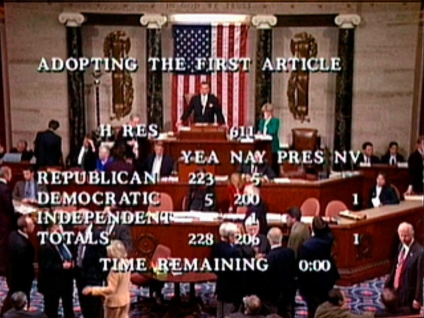 A video still from Dec. 19, 1998, shows speaker pro tempore Ray LaHood preparing to announce the result of the House's vote on the first article of impeachment against Mr. Clinton.AP Photo/APTN