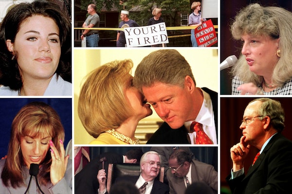 In 1998, the impeachment case against Bill Clinton (shown at middle with wife Hillary) centred on claims that he perjured himself, and encouraged others to do the same, by lying about an illicit relationship with White House intern Monica Lewinsky, top left, and sexual harassment allegations by Paula Jones, bottom left. Special counsel Ken Starr, bottom right, investigated Mr. Clinton's relationships with the women, and heard graphic details and surreptitiously recorded conversations about Ms. Lewinsky from her friend Linda Tripp, top right. Henry Hyde, bottom middle, was chairman of the House judiciary committee and served as chief prosecutor in Mr. Clinton's Senate trial.Reuters, The New York Times