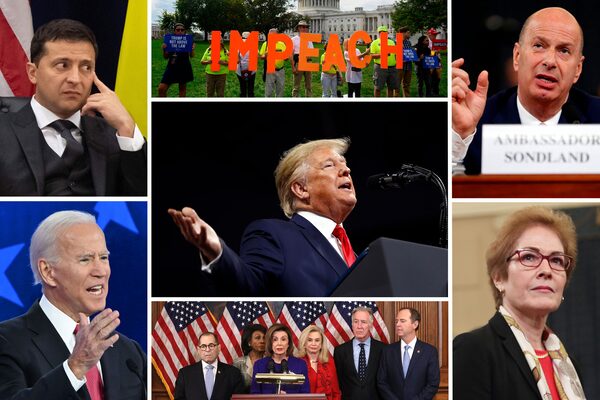 In 2019, the impeachment case against Donald Trump involves his communications with President Volodymyr Zelensky of Ukraine, top left, and whether he obstructed justice or abused his power by pressing Mr. Zelensky for an investigation of a firm linked to the son of potential presidential candidate Joe Biden, bottom left. The articles of impeachment were drafted at the behest of Democratic House Leader Nancy Pelosi, bottom middle, after weeks of testimony from current and former diplomats with knowledge of the matter, including Gordon Sondland, top right, and Marie Yovanovitch, bottom right.The Associated Press, Reuters, AFP/Getty Images