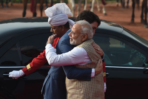 (FILES) India's Prime Minister Narendra Modi (R) embraces Canada's Prime Minister Justin Trudeau (C) during a ceremonial reception at the Presidential Palace in New Delhi on February 23, 2018. Canada on September 18 accused India's government of involvement in the killing of a Canadian Sikh leader near Vancouver last June, prompting tit-for-tat diplomatic expulsions after New Delhi rejected the charge as "absurd." (Photo by PRAKASH SINGH / AFP) (Photo by PRAKASH SINGH/AFP via Getty Images)PRAKASH SINGH/AFP/Getty Images