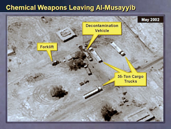 Mr. Powell's presentation to the United Nations Security Council included this image, which the U.S. State Department claimed showed trucks shipping out chemical weapons, as evidence that Iraq was hiding material from U.N. weapons inspectors.U.S. Department of State/Getty Images