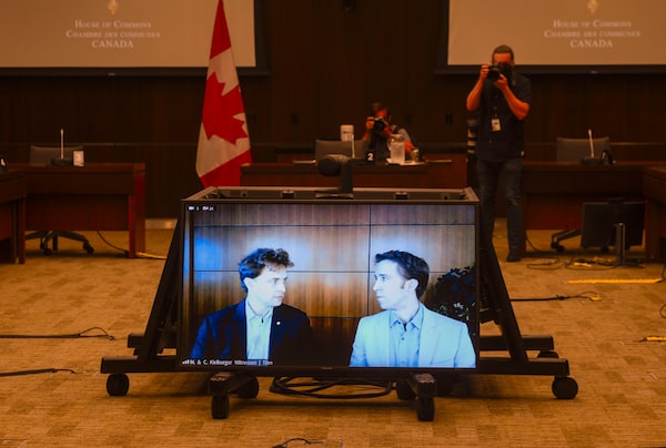 Marc Kielburger, screen left, and Craig Kielburger, screen right, appear as witnesses via videoconference during a House of Commons finance committee in the Wellington Building in Ottawa on July 28, 2020.Sean Kilpatrick/The Canadian Press