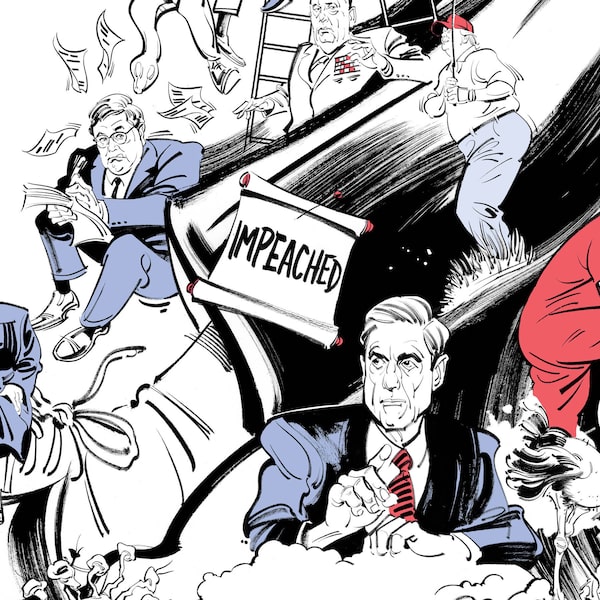 Robert Mueller, right, spent more than a year investigating whether the Trump campaign’s ties to Russia amounted to a conspiracy, or whether the President obstructed justice to cover it up. That probe fizzled out, but stopped short of exonerating him. Another scandal over political interference in Ukraine made it to an impeachment vote in the House (which passed) and a trial in the Senate (which acquitted him).