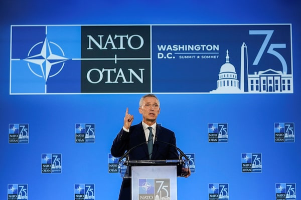 NATO Secretary General Jens Stoltenberg holds a press conference, during NATO's 75th anniversary summit, in Washington, on July 10.Nathan Howard/Reuters