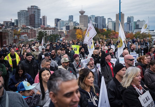 Locked out International Longshore and Warehouse Union Local 514 port workers and supporters at a rally in Vancouver in 2024. Recent Pollara data found that nearly half of the electorate – 46 per cent – would consider voting for the party today.DARRYL DYCK/The Canadian Press