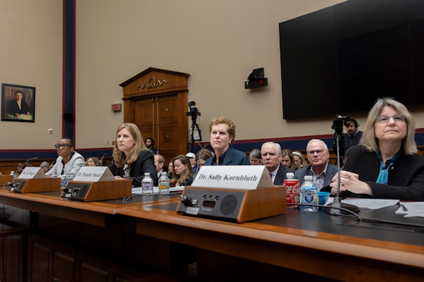 From the left, Claudine Gay, president of Harvard University; Elizabeth Magill, president of the University of Pennsylvania; Pamela Nadell, a professor at American University; and Sally Kornbluth, president of the Massachusetts Institute of Technology, appear at a House Committee on Education and the Workforce hearing on Capitol Hill regarding antisemitism in schools, on Dec. 5.TOM BRENNER/The New York Times News Service