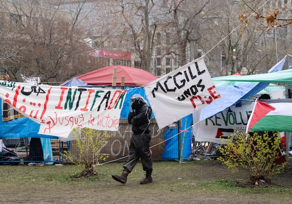 Pro-Palestinian activists at their encampment on the McGill University campus in Montreal on May 1.Ryan Remiorz/The Canadian Press