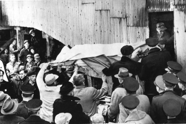 On Nov. 3, 1956, rescuers carry out one of the first survivors of the miners trapped at Springhill.The Canadian Press