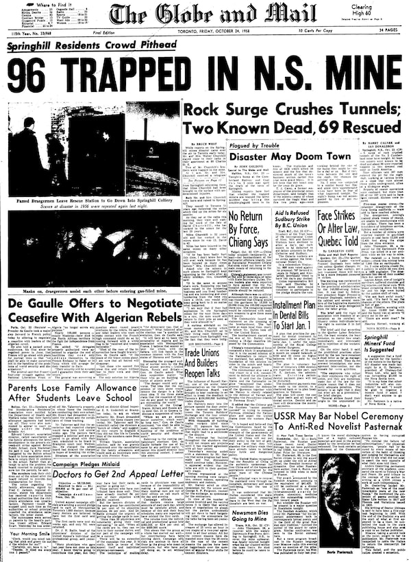 The Globe and Mail's front page on Oct. 24, 1958, offers initial estimates of the dead and missing miners in the Springhill disaster the day before.