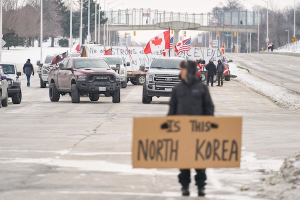 Anti vaccine mandate protestors block the roadway leaving the Ambassador Bridge border crossing, in Windsor, Ont., on Feb. 8.GEOFF ROBINS/AFP/Getty Images