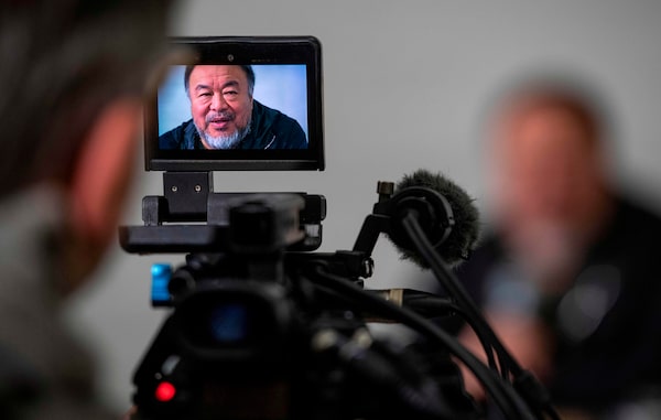 Ai Weiwei addresses journalists at his Berlin studio on Feb. 11.JOHN MACDOUGALL/AFP via Getty Images/AFP/Getty Images