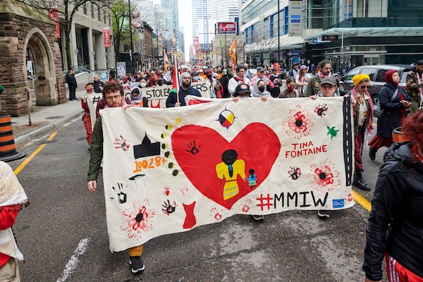 Demonstrators march up Yonge Street in Toronto as Canada marks National Day of Awareness for Missing & Murdered Indigenous Women and Girls and 2SLGBTQI+ people, also known as Red Dress Day, on May 5.Sammy Kogan/The Globe and Mail