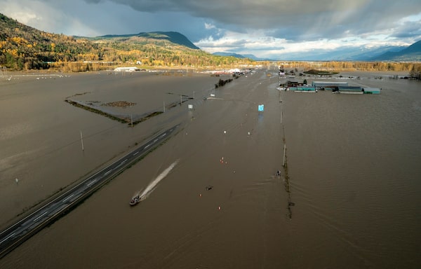 A boat speeds along a flooded highway 1 in Abbotsford, B.C., on Nov. 16, 2021.JONATHAN HAYWARD/The Canadian Press