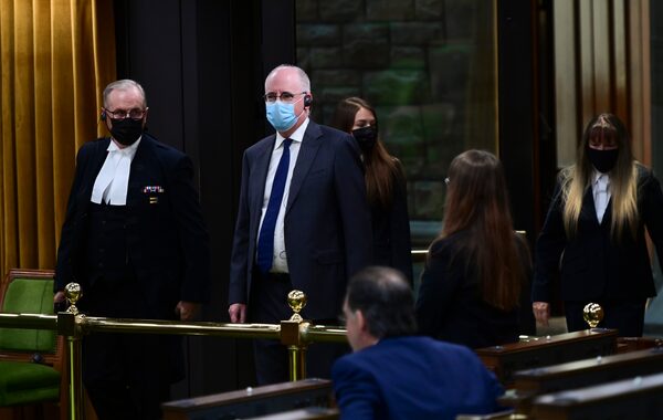 President of the Public Health Agency of Canada Iain Stewart, second from left, approaches the bar in the House of Commons to be admonished by the Speaker of the House of Commons Anthony Rota on Parliament Hill in Ottawa.Sean Kilpatrick/The Canadian Press