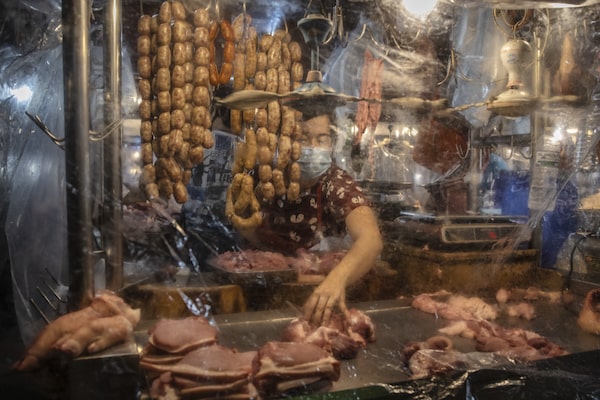A vendor arranges meat inside her stall covered in plastic to enforce social distancing at a wet market in Las Pinas, Metro Manila, Philippines on March 30, 2020.Ezra Acayan/Getty Images