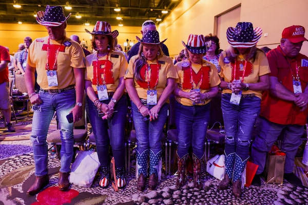 The Trump Tribe of Texas participates in a prayer at the Conservative Political Action Conference in Dallas, Texas, on Aug. 4.SHELBY TAUBER/Reuters